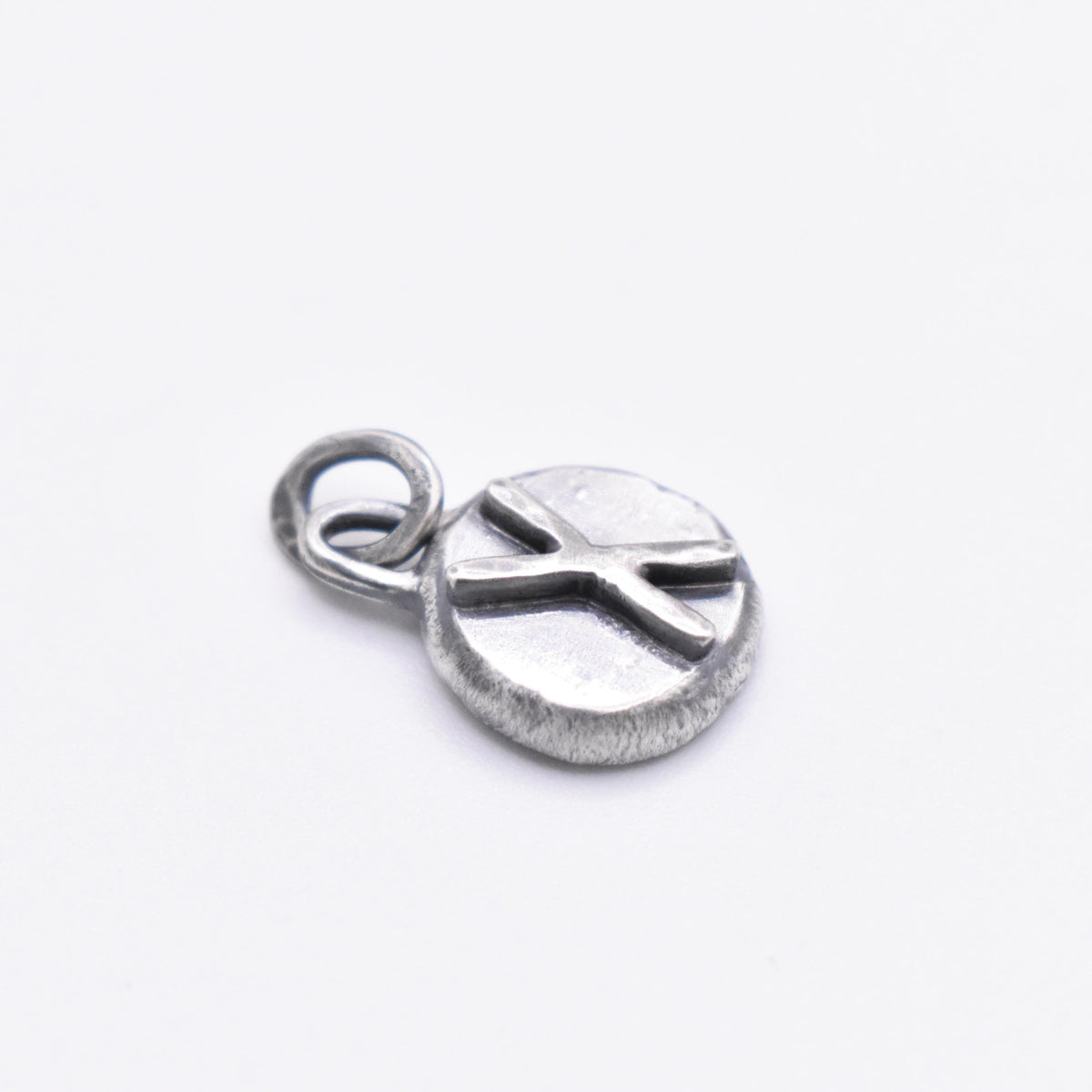 A small and blackened sterling silver pendant with a hammered Gebo rune in the centre. Gebo represents a gift, symbolising partnership, generosity and relationships in both material and spiritual forms.