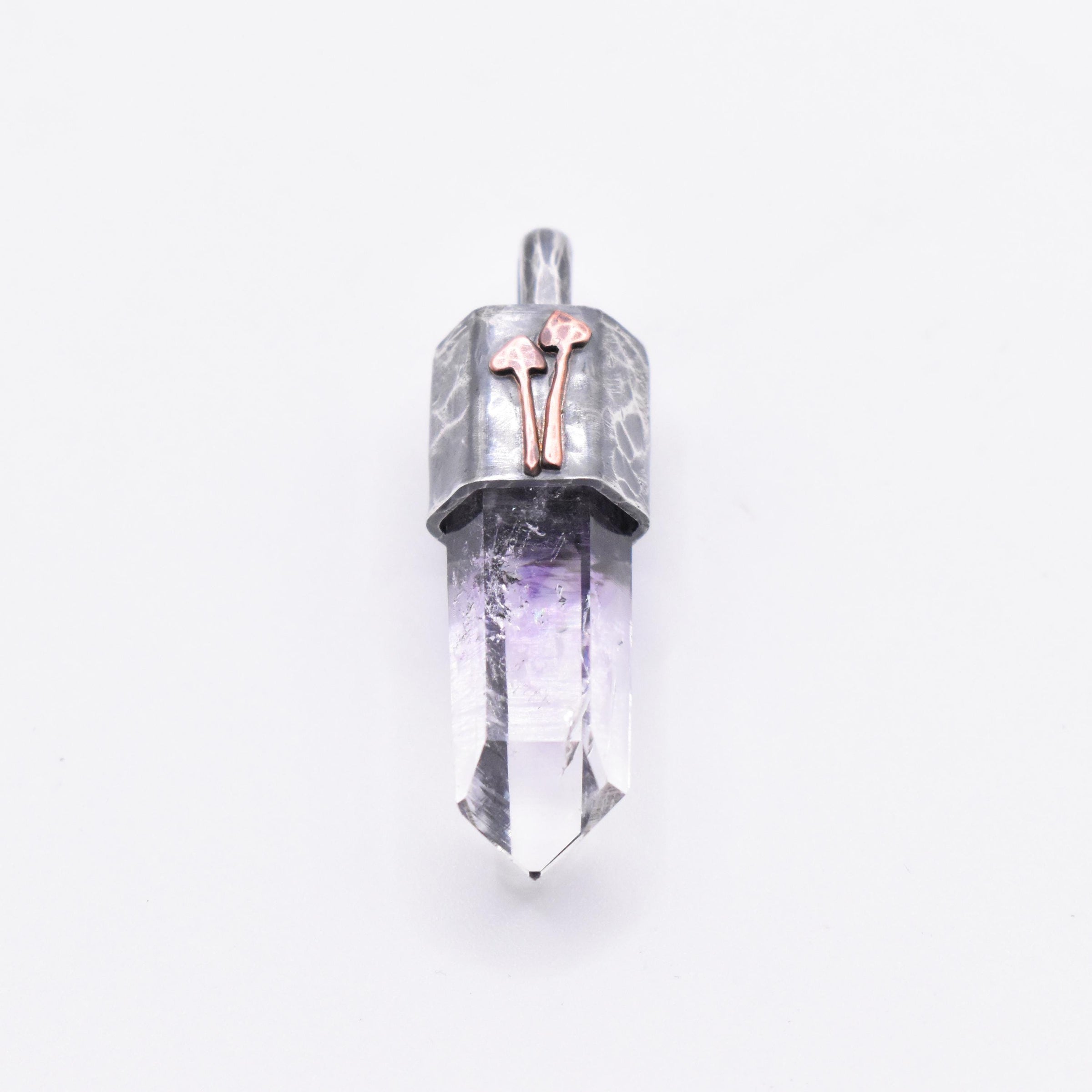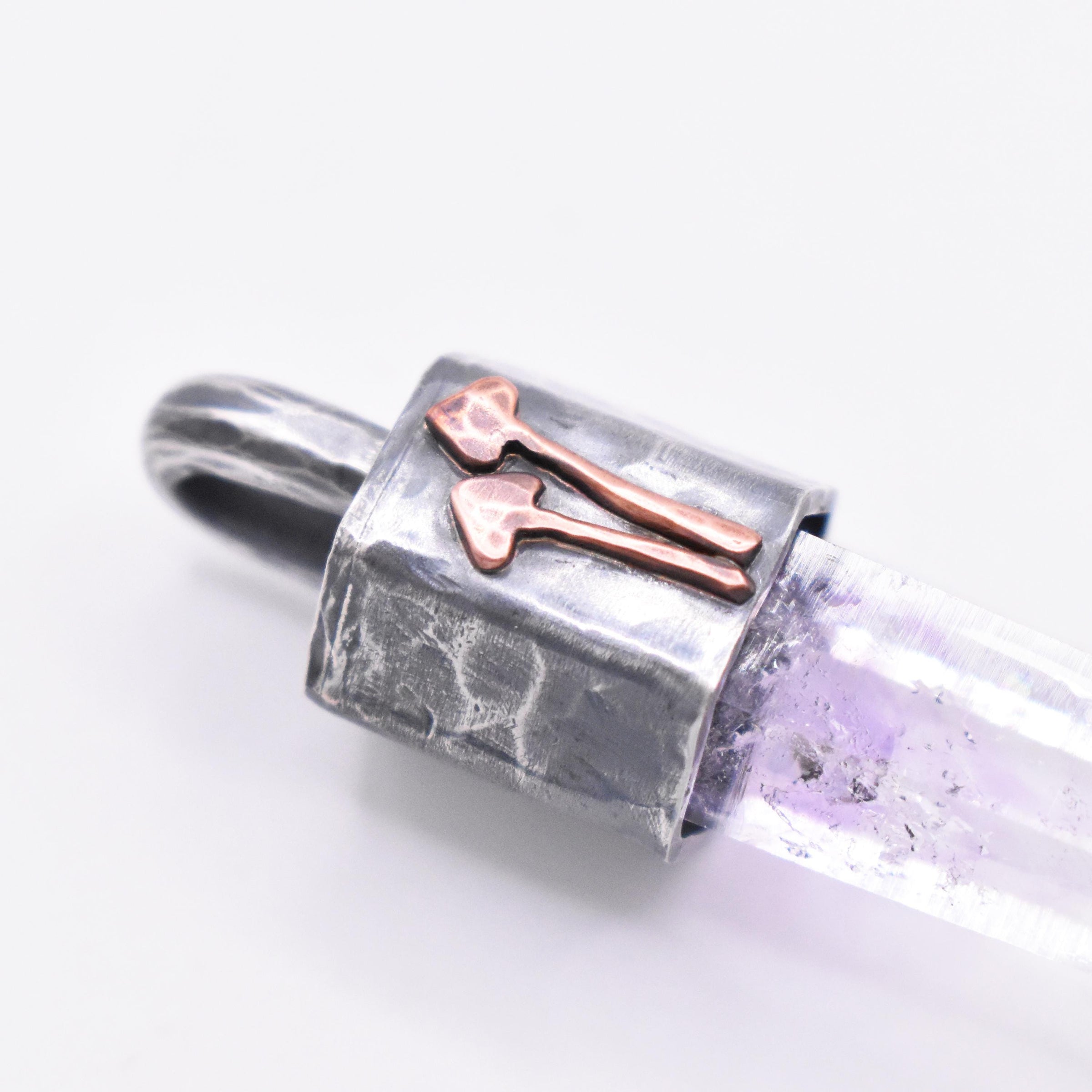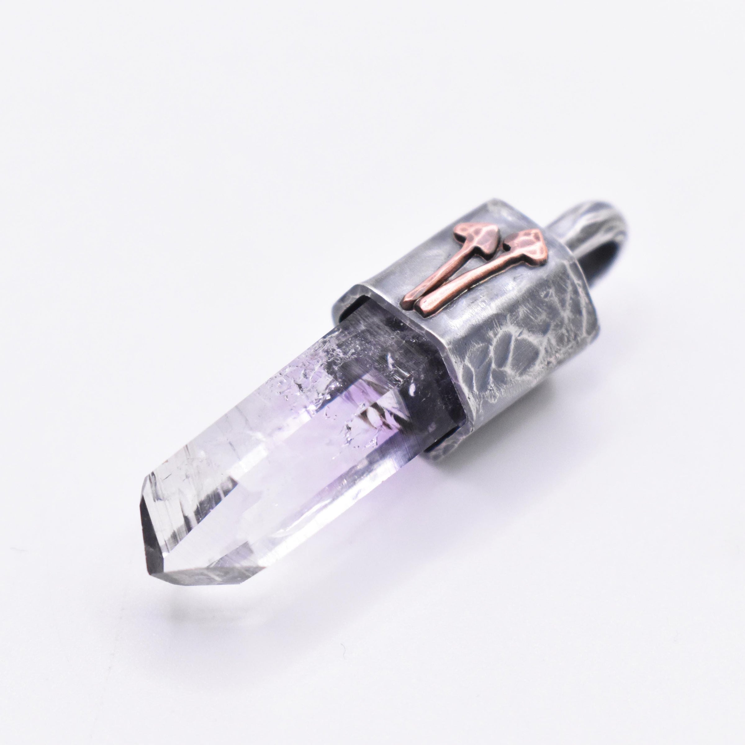 An ethically hand-mined, museum-grade Brandberg crystal in an oxidised sterling silver setting with hammered copper decoration. This one-off pendant is unique in design and energy.