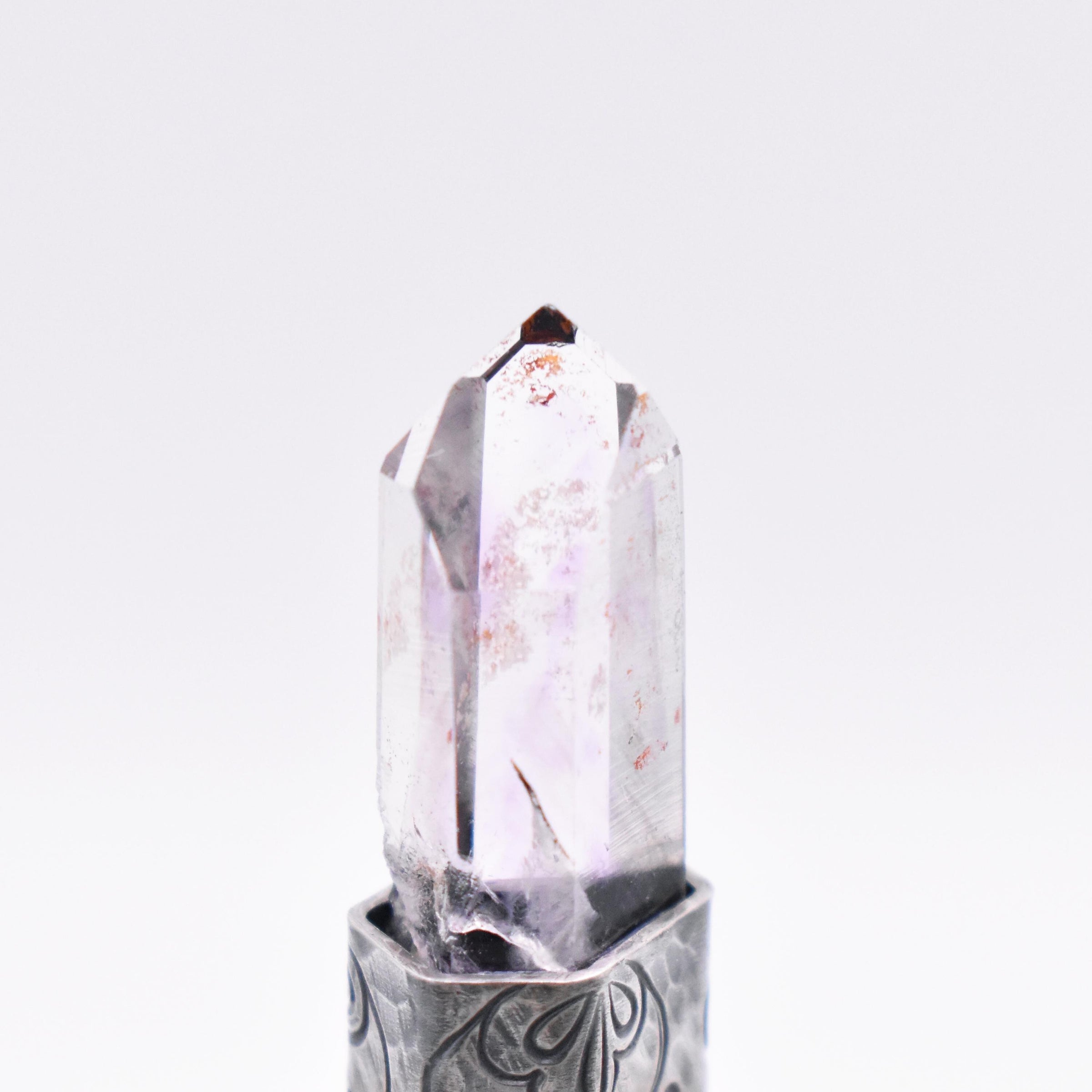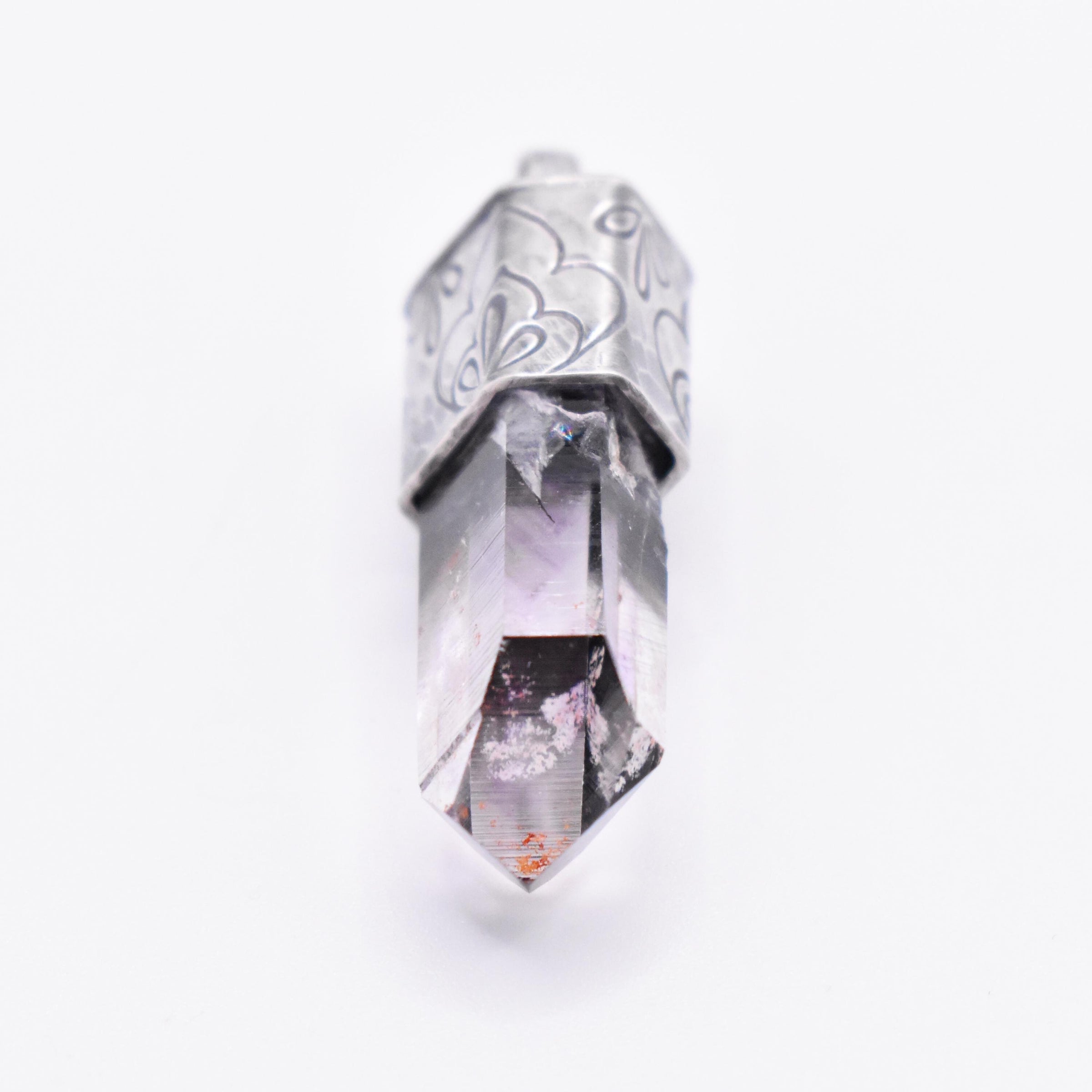 A Brandberg quartz crystal set in hammered and stamped sterling silver.