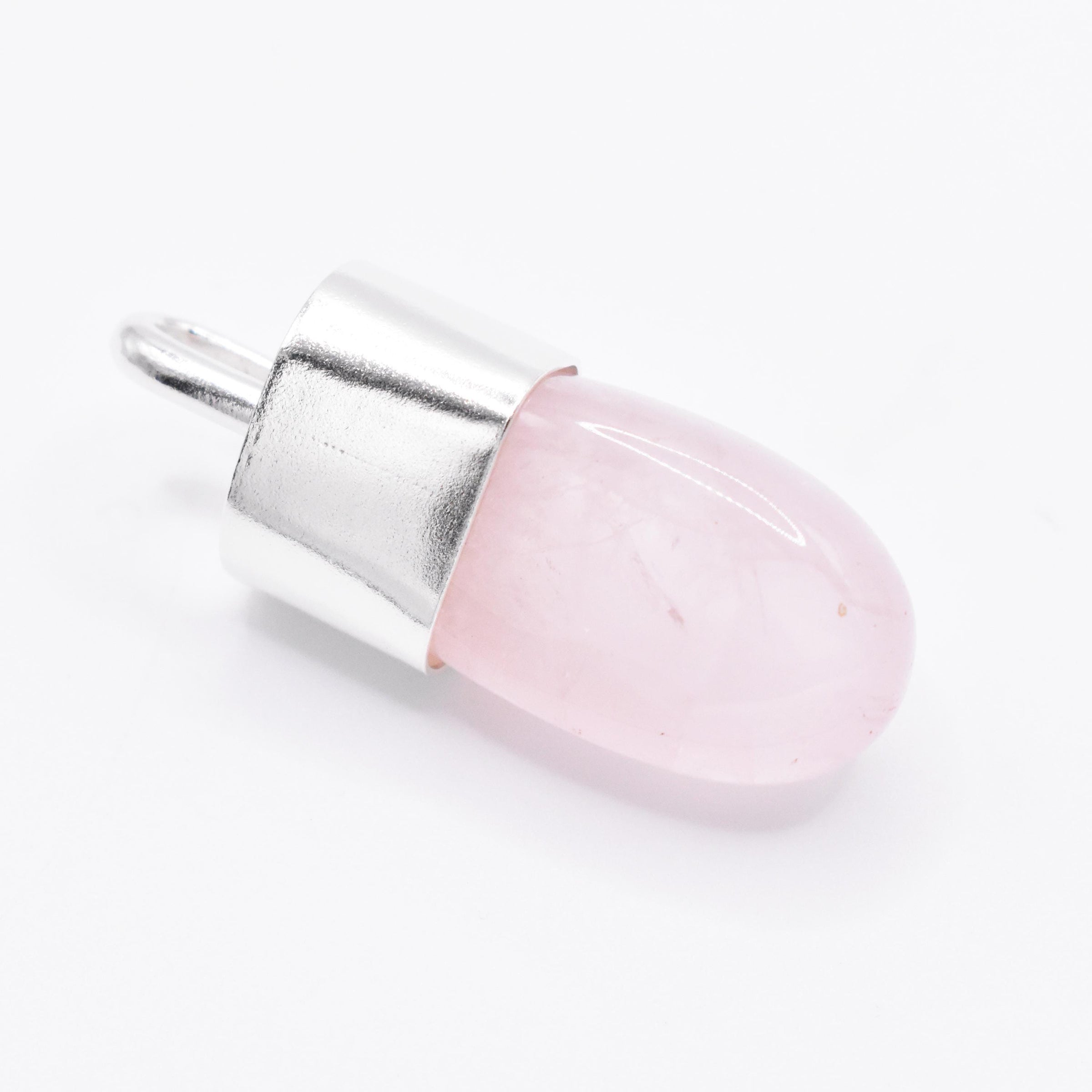 A chunky polished rose quartz set in a sterling silver cap with an 8mm green aventurine cabochon on the front face.