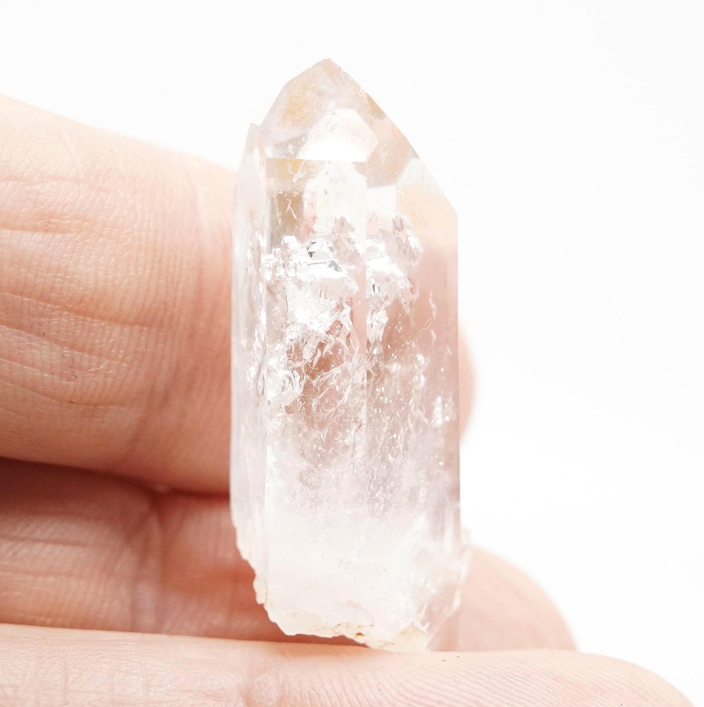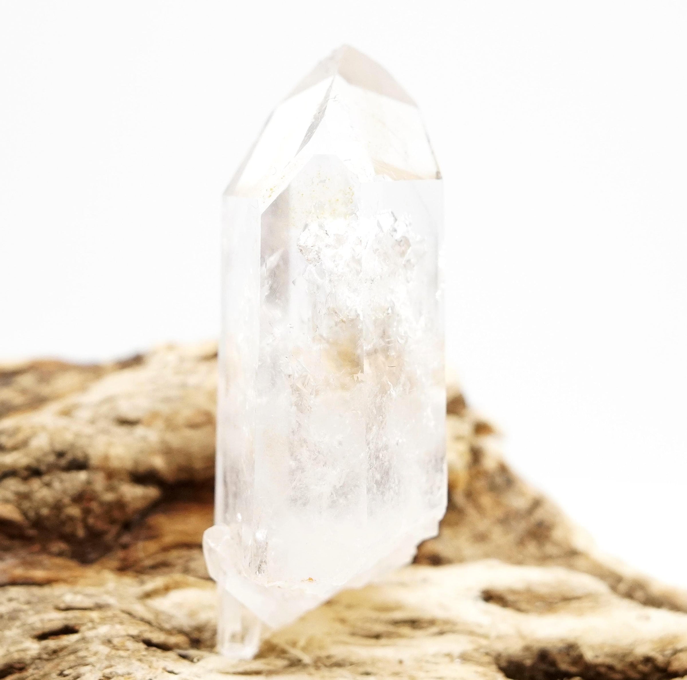 A super-bright and beautifully formed museum-grade (perfect) Brandberg Dow. There are two stationary bubbles, and I marked one in the picture, because finding clear bubbles in clear quartz is not easy.