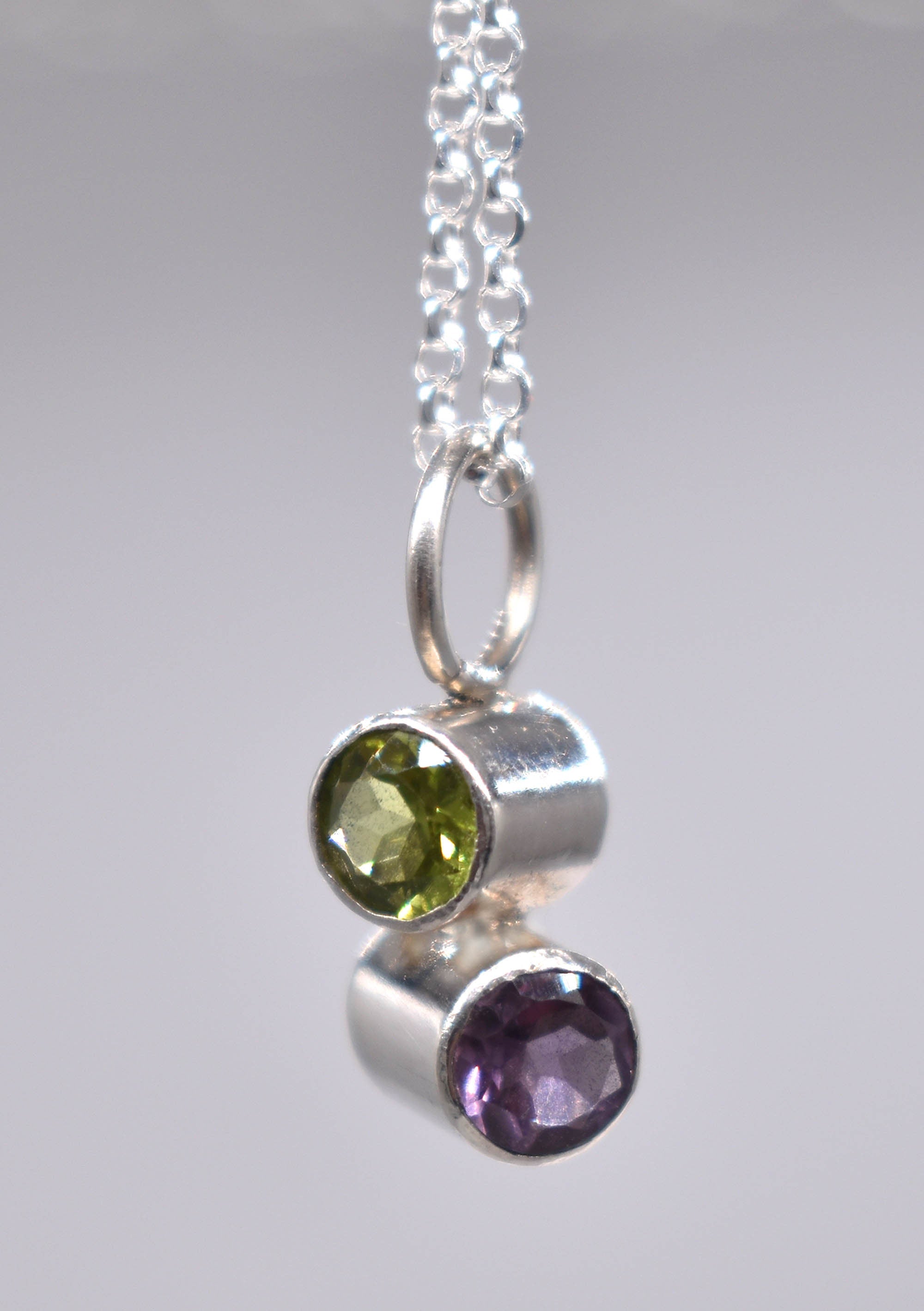 This unique pendant has bright natural faceted Amethyst and Peridot gemstones.
