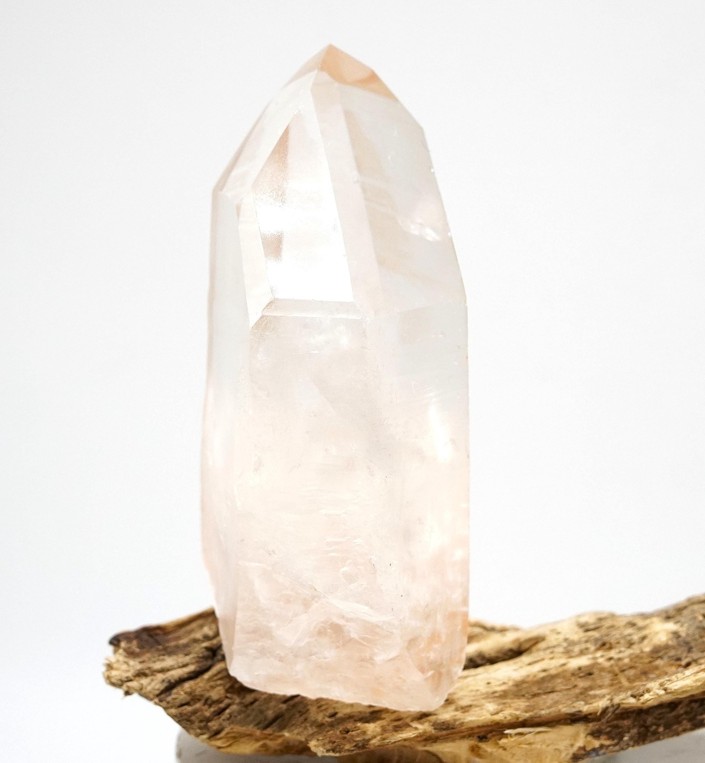 A stunning Golden Lemurian Rainbow crystal with a delicate pinkish hue and a self-healed base. It also has a Channelling formation and a tiny, but easily seen Tabby Penetration Bridge.