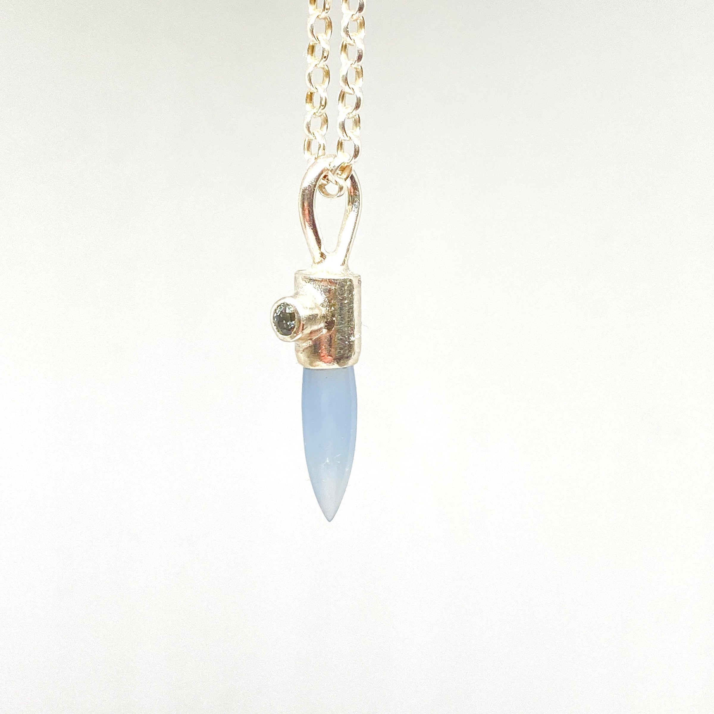 An unusually shaped Blue Chalcedony set with a natural & untreated faceted 3mm Blue Sapphire. A unique, relatively dainty handcrafted pendant. Blue chalcedony resonates with the throat chakra to improve communication, and blue sapphire strengthens the third eye chakra, enhancing intuition.