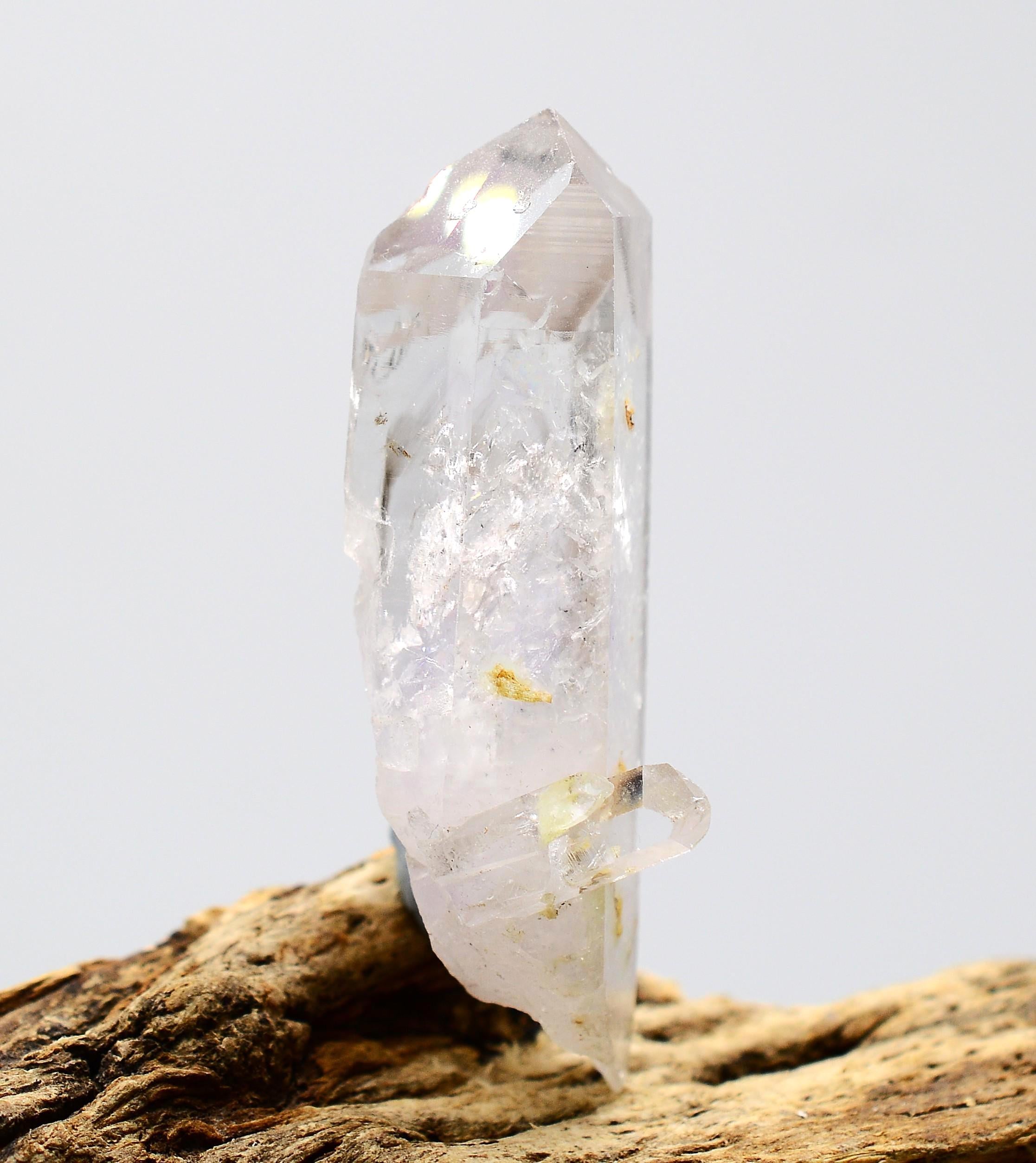 A stationary bubble in a bright Brandberg Transmitter with delicate amethyst clouds. A self-healed base, small rainbows and a few prehnite passengers.
