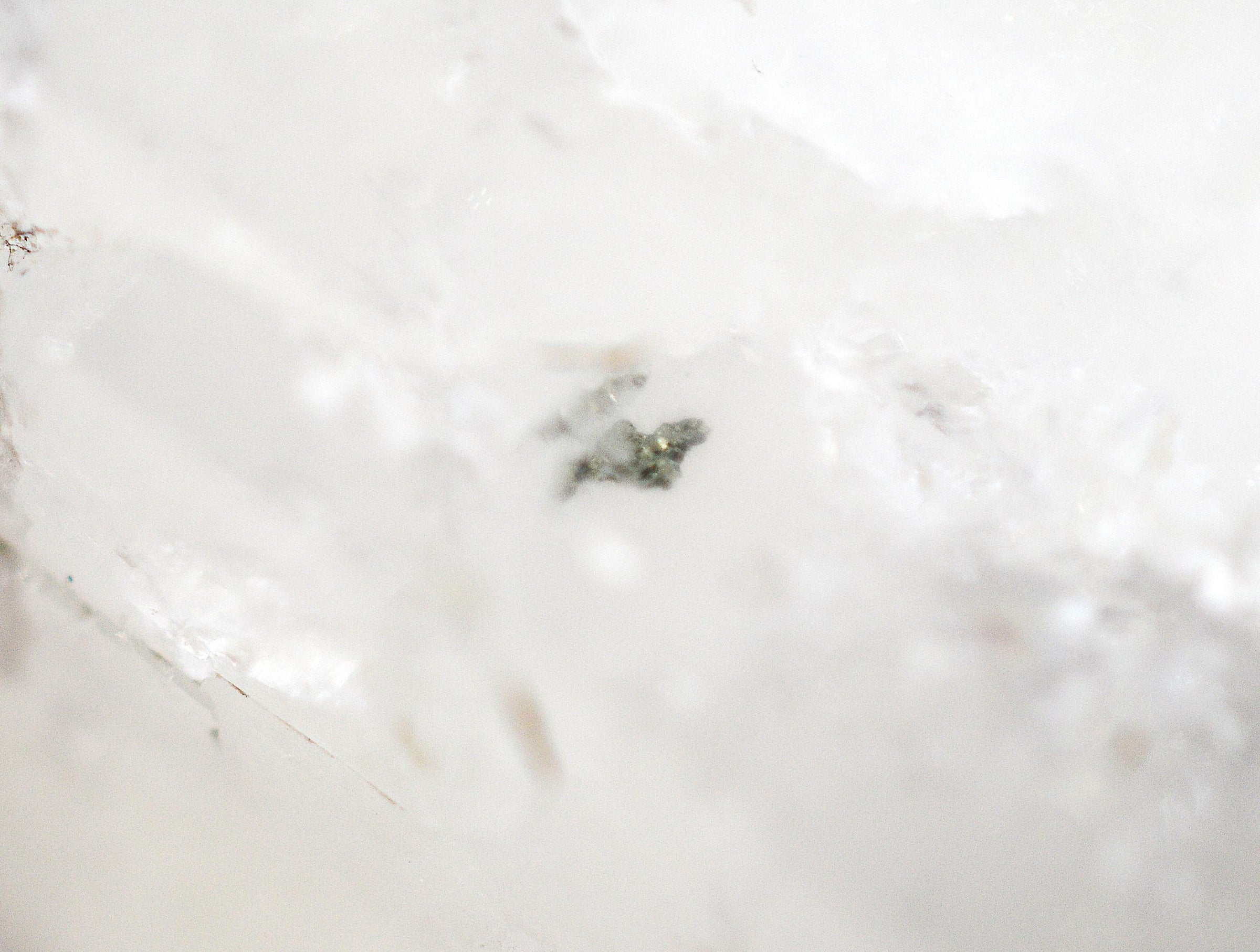 Gold on a milky mass (rough rock, not fully formed crystals) is available but rare. Gold in crystals like this is exceptionally rare. This Welsh crystal has a tiny, easily visible gold nugget.