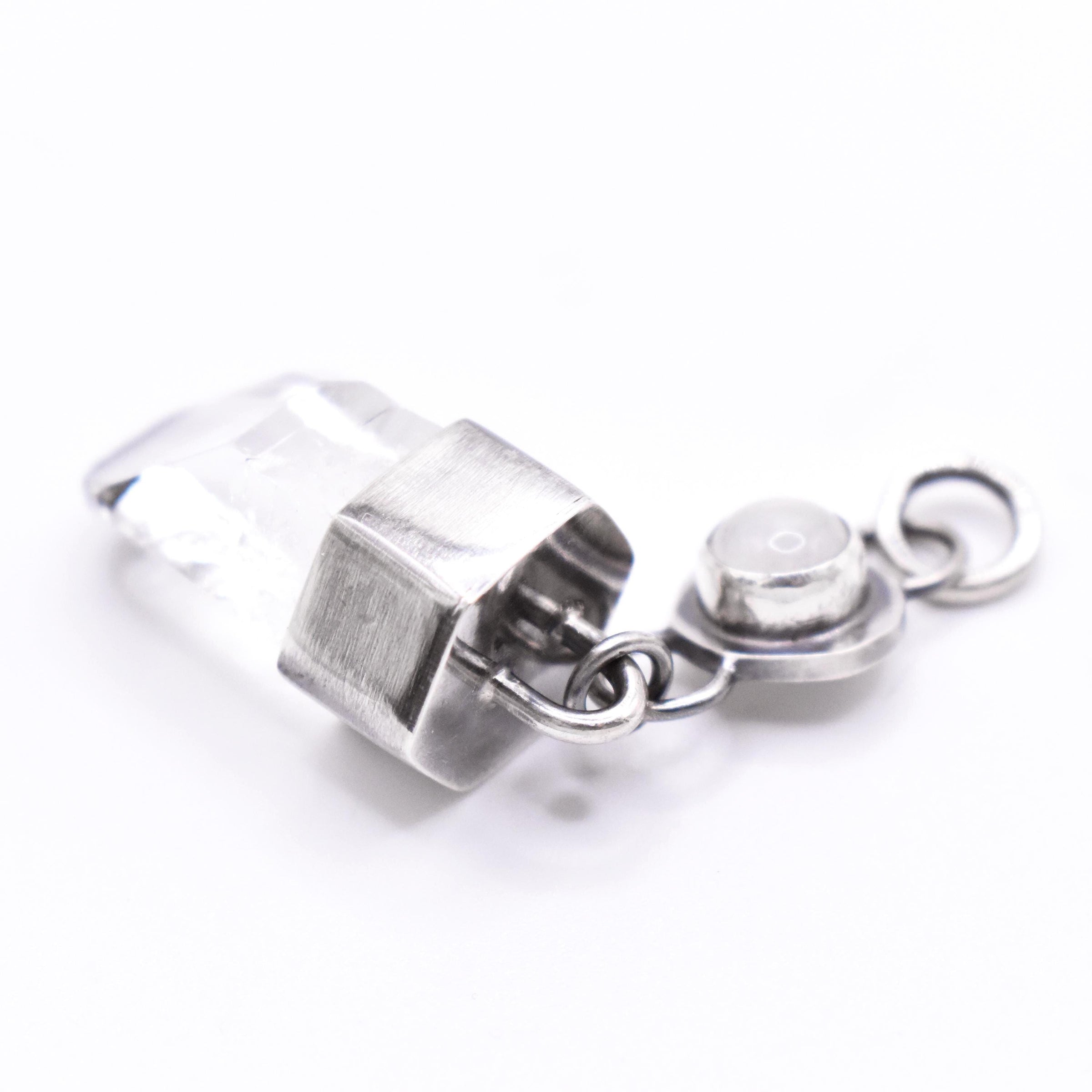 An ethically hand-mined Himalayan quartz crystal set in oxidised sterling silver with a 6mm rainbow moonstone cabochon. Half of the moonstone has peachy pink shades fading into the aqua and blue hues of the other half. This is faintly visible in the first image but much more visible in natural light.